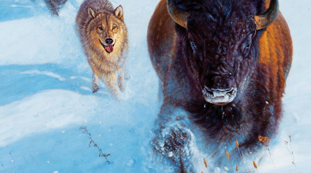 “The Yellowstone ecosystem and Ted Turner’s Flying D Ranch are two of the few places you can still find big herds of pure-strain North American bison,” the artist says. “I found places on Ted Turner’s ranch and positioned myself where bison would come down through the deep snow — sometimes right at me. Bison are designed to plow through snow like no other animal. They can survive in almost any environment, but the way they move in the deep snow fascinates me.”