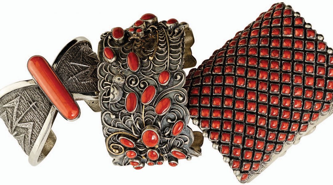 Silver cuffs from top: Sunshine Reeves (Navajo), $1,050; Watson Honanie (Hopi); Jennifer Curtis (Navajo), $1,200. Mediterranean coral and silver bead necklace by Richard Abeyta (Santa Domingo), $6,000.