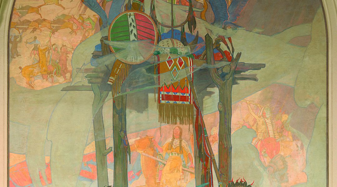The recently unveiled Indian Memories murals comprise five triptychs — Youth, Buffalo Hunt, War, Women, and Art Work — and the large single mural Happy Hunting Ground. “You might expect images of progress, Conestoga wagons crossing the plains, farmers plowing the prairie, or ranchers moving cows, [but] for this series, True painted epic scenes of everyday Native life that included women and children and not just traditional warriors,” says art historian Peter Hassrick, director emeritus of the Buffalo Bill Center of the West and the Denver Art Museum’s Petrie Institute of Western American Art.