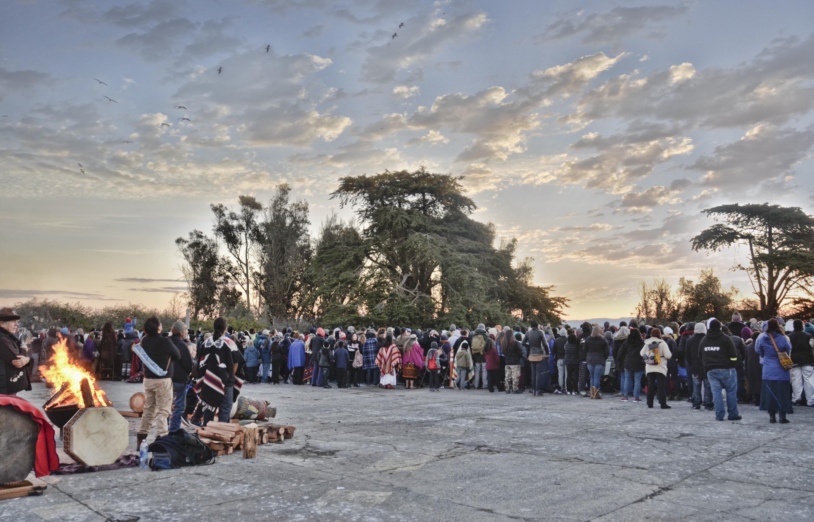 Alcatraz Island in San Francisco Bay is normally a cold, unwelcoming place once reserved for infamous criminals. However, for the last four decades on Thanksgiving day, American Indians of all tribes have returned to the island for the annual Indigenous Peoples' Sunrise Gathering. The event, which commemorates the Occupation of Alcatraz from November 20, 1969, to June 11, 1971, by 89 members of the group Indians of All Tribes, is planned and organized by the International Indian Treaty Council and welcomed more than 3,500 people this year.