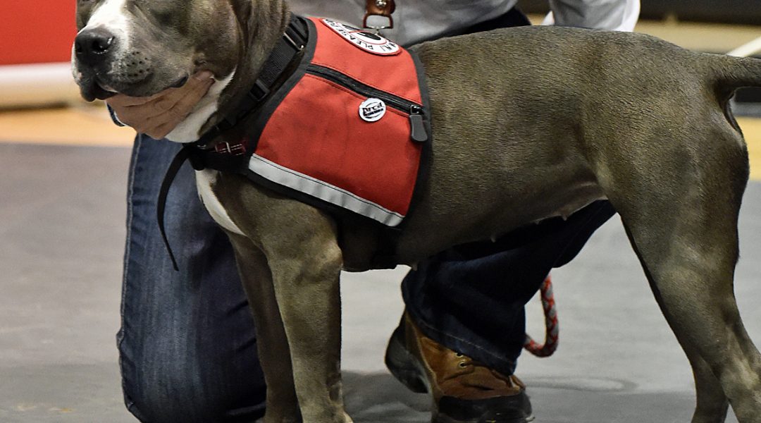 Her official service dog vest says “Please Don’t Pet Me.” Fat chance among the cowboys and cowgirls of the Wrangler National Finals Rodeo. Everything about her from her huge block head and matching paddle paws, to those comely eyes and lopsided grin is irresistible.