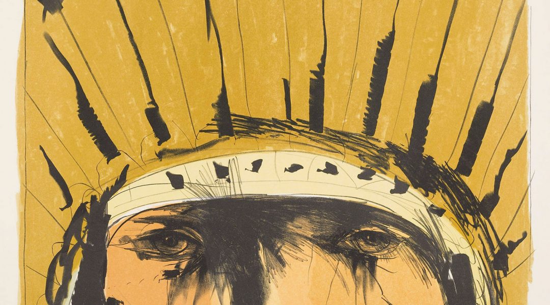 With Thomas Berger’s 1964 historical novel Little Big Man and the American Indian Movement as inspiration, Baskin embarked on a series of large-scale prints and drawings of American Indians, a theme he would return to over several decades. He took a cue from portraits by 19th-century photographers Edward S. Curtis and Frank A. Rinehart and focused on faces, which he portrayed in simultaneous dignity and despair.