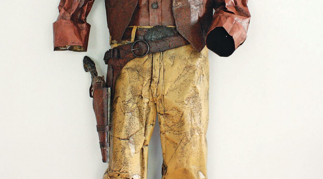 Metal sculptor Chris Beck has a way of turning the beat-up into the beautiful. A “collector of things trashed,” Beck looks to artists like Charlie Lucas, Lonnie Holley, and R. Michael Wimmer in his own take on reviving discarded things to make something powerful and new. Using found materials such as used car parts, chicken coop metal, barn roofs, latches (anything old, rusty, and hard to find), he creates handmade metal clothes, ball caps, birds, Native American headdresses, waitress aprons, and other everyday items that take on new dimensions when made in metal.