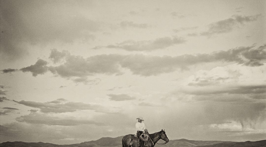The method has led to a lot of friendships in addition to photographs. There’s friend Nelson Garber on his horse, Shotgun, with his border collie, Turbo, captured at the end of the day on his remote ranch in Old Horse Springs, New Mexico, right after a dust storm. We notice the soft light that came with the calm; Baxter remembers that Garber had just handed his wife their newborn baby girl, whom he had cradled and covered in his arms when the wind kicked up.