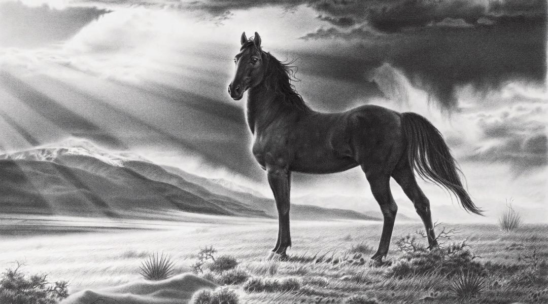 The horse’s power and expression are the soul of the drawing. “Amid all the darkness and exhaustion, its body is strong and full of life and is wrapped around the weary cowboy almost as if embracing him. The eye exemplifies the incredible strength I pulled from this horse to get through those tough times. I hope my work will offer encouragement to people who are going through turbulent, dark times in their own lives.”