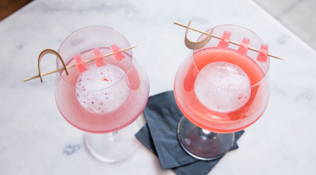Muddle lemon wheel and berries together. Add the rest of the ingredients and shake. Pour over one ice ball in a large wine glass. Garnish with three gummy bears on a spear.