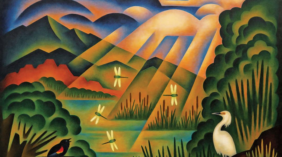 Sushe’s studio, located in the couple’s modernist home near Denver, feels like a museum of American painting. In her long career, she has explored a variety of styles, some reminiscent of Thomas Hart Benton, Raymond Jonson, and even Vance Kirkland. She’s particularly influenced by Jonson, who, along with the Transcendental Painting Group he led in Santa Fe, sought to find fresh approaches to space, color, light, and design to push painting beyond the appearance of the physical world toward something transcendent.