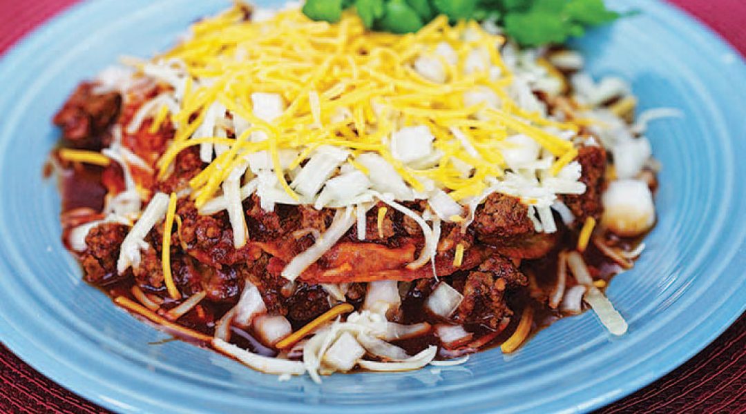 Ladle red chile, including a small amount of the meat, over the tortilla stack until it is puddled up as deep as it will stand around the base of the stack. Cover the enchiladas lightly with grated cheese and place in a 250-degree oven for 20 minutes.