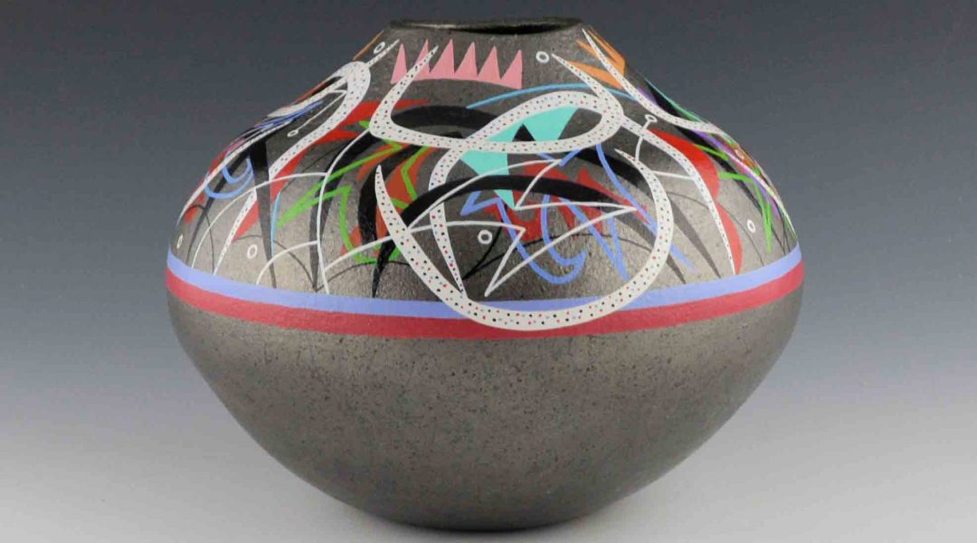 Virtually every pot Les Namingha makes is a revolution in Native pottery. His works include traditional forms and designs harking back to his ancestor Nampeyo of Hano. Then, he veers into contemporary art with bright acrylic paints and designs that suggest Keith Haring. It seems like street artists might have burst into his studio, tagging the pots in his Urban series with cans of bright spray paint.