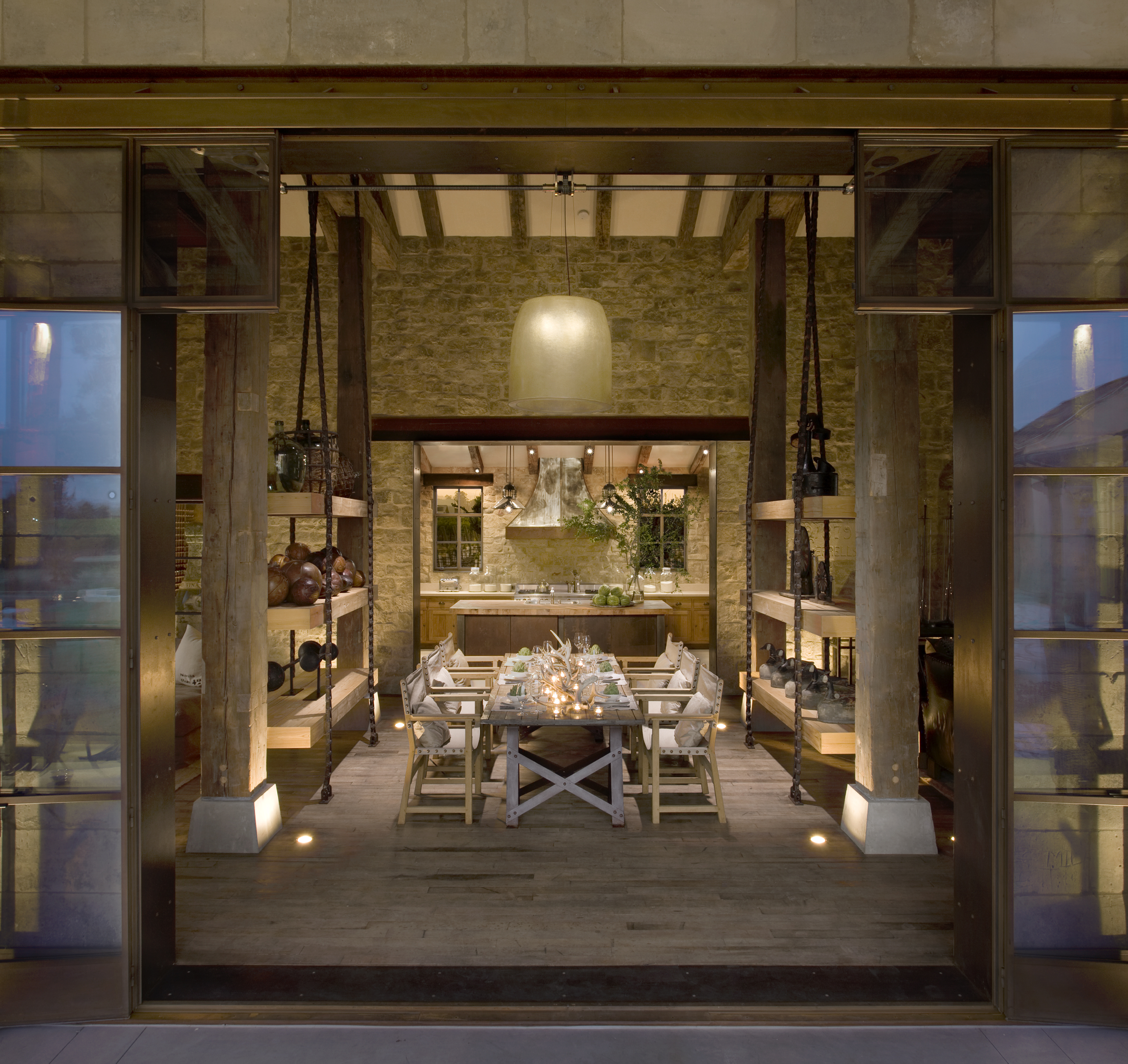 From Stone Houses: The great room is one of the two French barn building styles the owner used to define the structures. It is a light-filled open space designed for entertainment. Simple in structure, the room looks on to Possum Lake and shares an adjacent space with the kitchen and food preparation areas. A picnic table in the center of the room signals that relaxed attire is appropriate and all are welcomed.