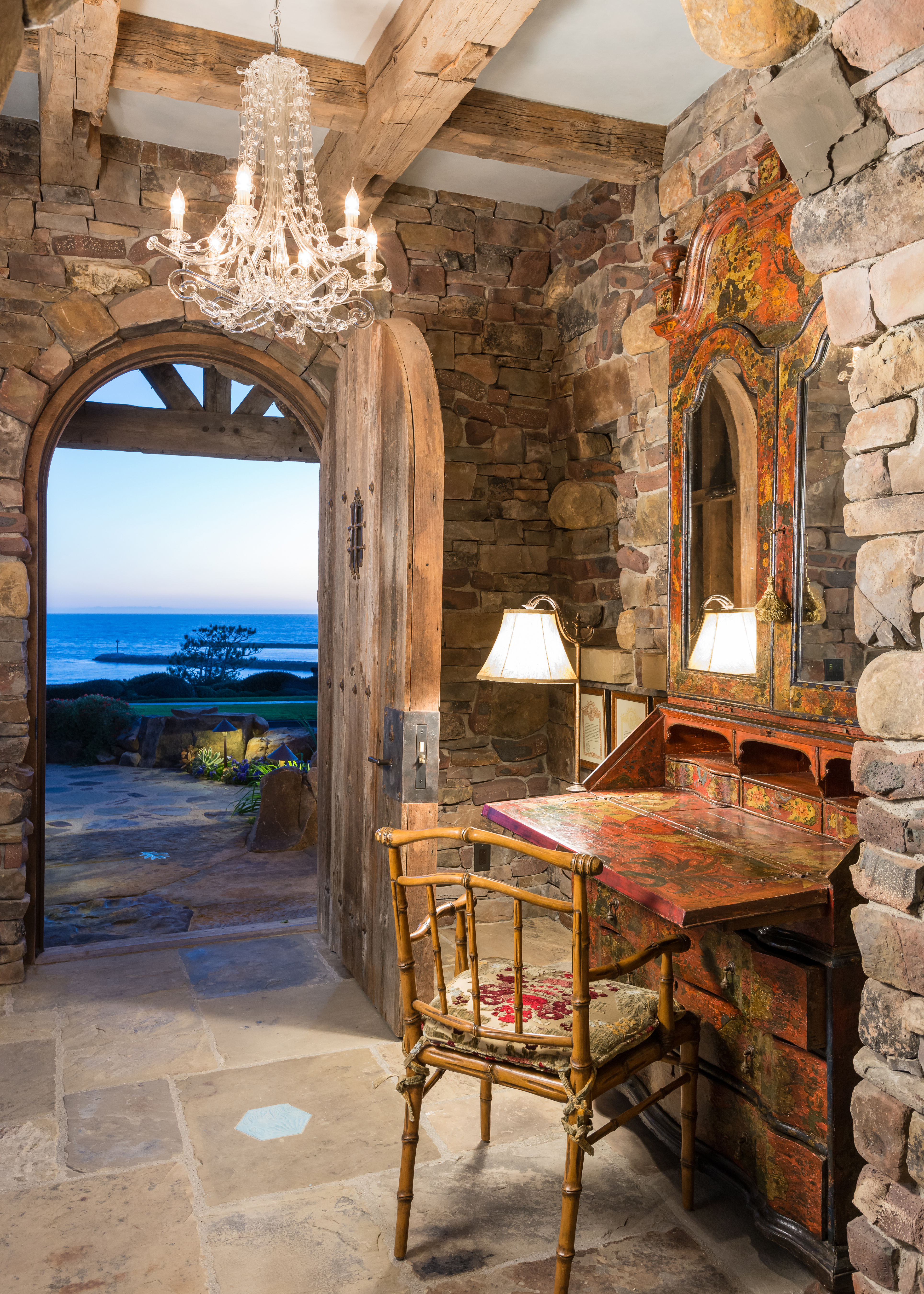 From Stone Houses: The entrance foyer is a charm of lacquer, bamboo, and timbers with an antique Chinese desk, a crystal chandelier, and view of the ocean.