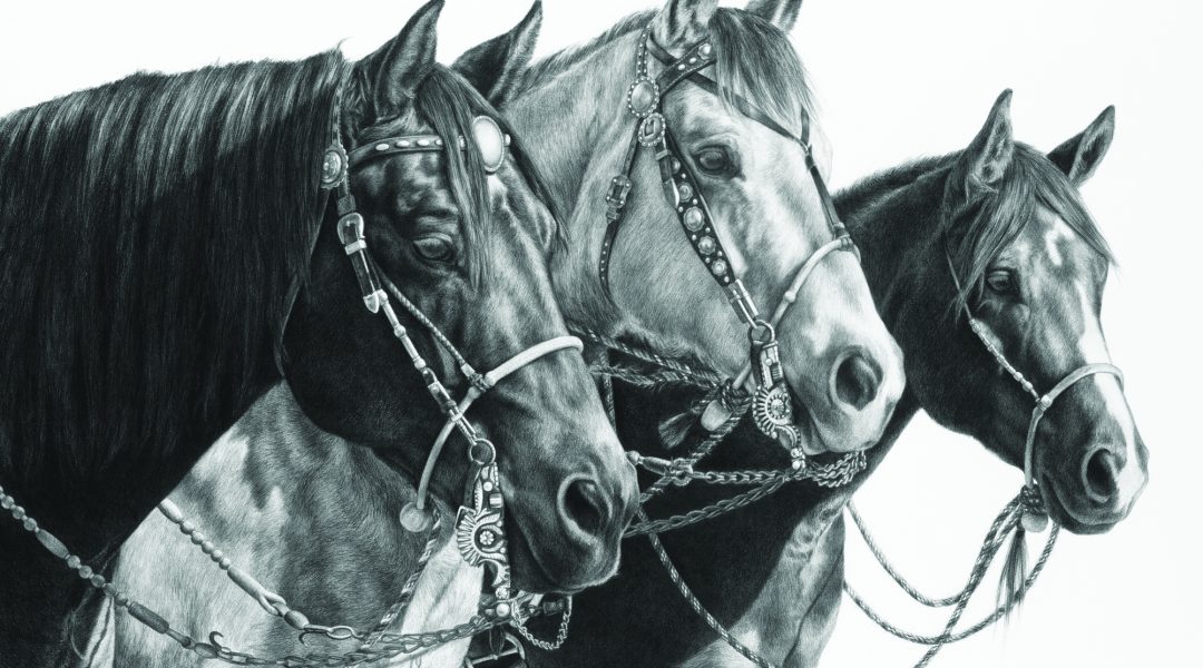 Those who know horses well, including horse owners and trainers who collect Timmons’ art, understand that it is the eye — along with the equine posture and stance — that conveys the animal’s spirit and mood. This kind of intimate knowledge of horses is the standard by which the Wyoming-based artist measures her work. She considers her drawing a success if experienced horsemen and women recognize the accuracy of her depictions, both in anatomical terms and the more intangible qualities embodied by a horse.