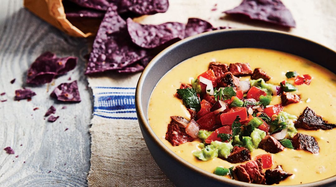 Slice the steak against the grain, then cut the slices into ½-inch cubes. Transfer the queso to a serving bowl, a small slow cooker, or a chafing dish over a flame. Top the queso with the steak and spoon on guacamole and pico de gallo. Serve warm with tortilla chips.