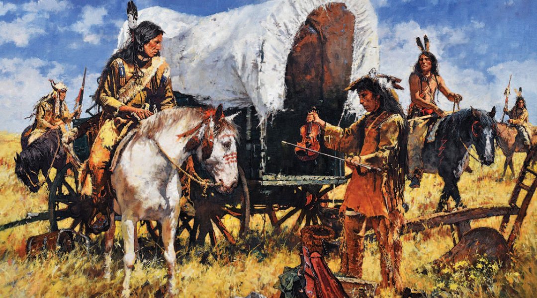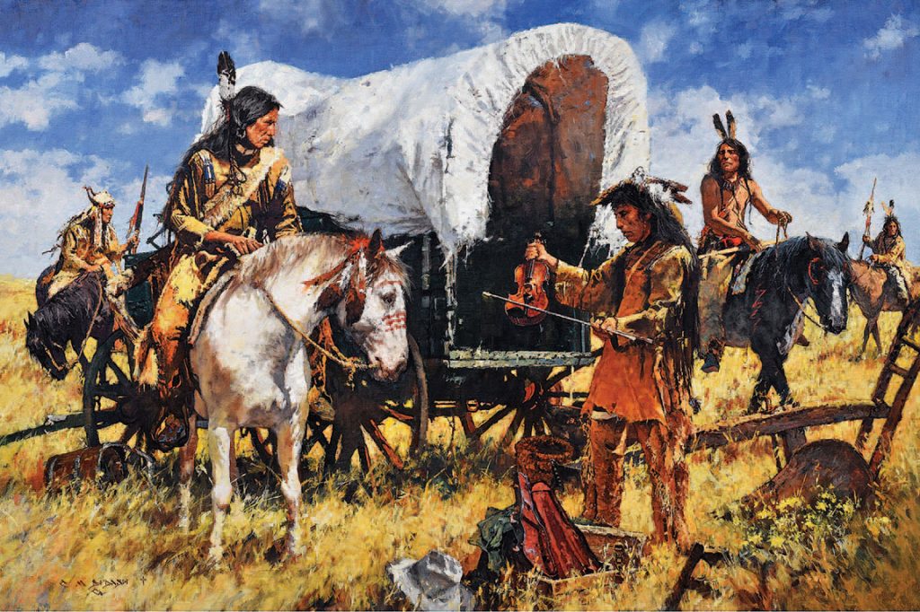 In Lost and Found, the Indians surrounding an abandoned covered wagon are quietly curious but not overly impressed as one man holds a violin he has pulled from its case. He touches the strings with the bow while two of the others look on. There’s a story in the face of each man (and that of the closest horse, clearly intrigued by the instrument’s sound), and it’s one that flows naturally from the situation, rendered in the painter’s skilled hand.