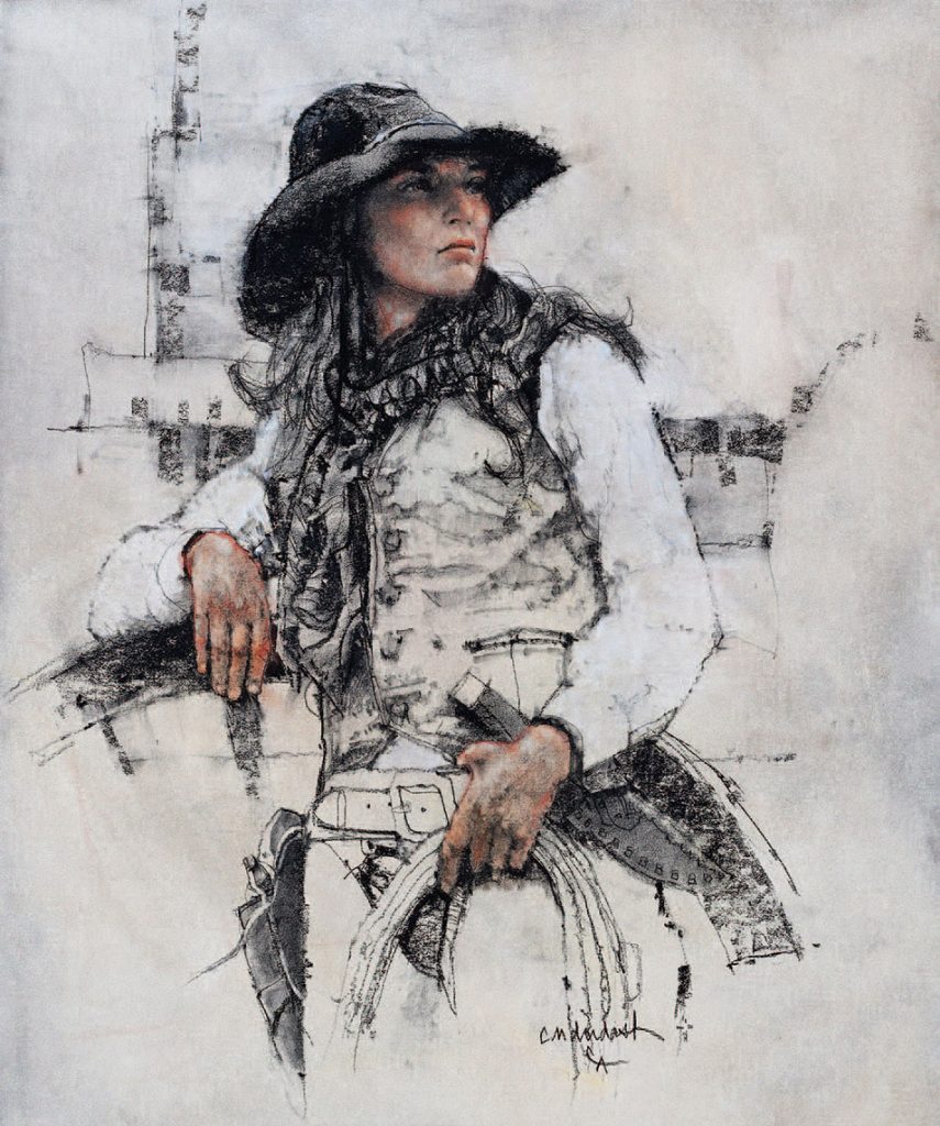 Dudash was honored with induction into the prestigious Cowboy Artists of America in 2016; he earned the organization’s gold medal in drawing for Cowgirl at its 2017 annual exhibition and sale. The portrait combines loose charcoal drawing with more detailed areas in colored chalk. The 67-year-old painter enjoys occasionally drawing and working in mixed media, styles that hark back to his illustration days. His oil paintings have also earned top awards in recent years at national events including the Eiteljorg Museum’s Quest for the West, the Briscoe Western Art Museum’s Night of Artists, and the C.M. Russell Museum’s annual show.
