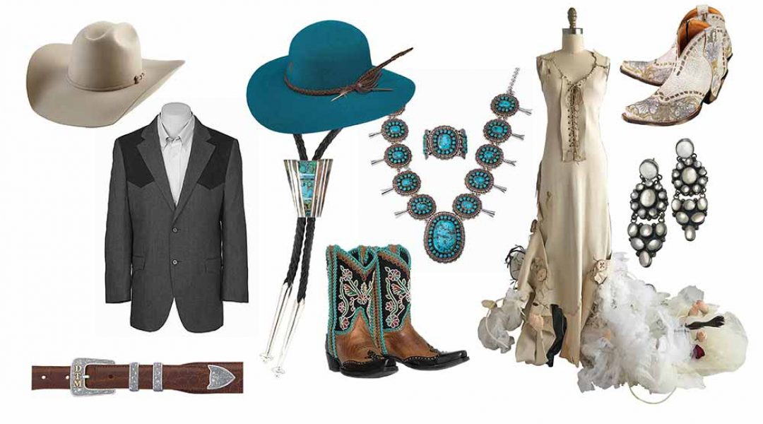 Free Spirit teal felt hat ($109.99), charlie1horsehats.com. Sterling silver inlaid bolo tie by Ray Tracey, Navajo ($730), sorrelsky.com. Sterling silver and Kingman turquoise squash blossom necklace and matching cuff by Larry “Le” Etsitty, Navajo (contact for pricing), maloufontheplaza.com. Capistrano boots ($750), ddranchwear.com.