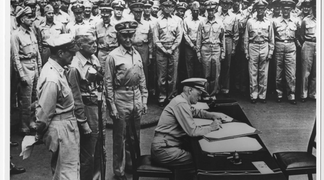 Fleet Admiral Nimitz signs the surrender document on board USS Missouri, Tokyo Bay, Sept. 2, 1945. Photography: Courtesy U.S. Navy/Nimitz Foundation