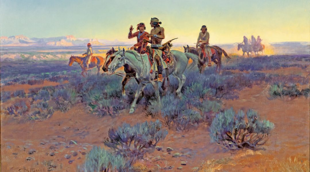 Photography: (all by Charles M. Russell [1864-1926]/Courtesy C.M. Russell Museum) (featured) The Navajos, 1919, oil on canvas, 24” x 36”, Desert Caballeros Western Museum, Wickenburg, Arizona, Gift of Mr. and Mrs. Aiken Fisher, photograph © Terrence Moore; One of the Rough String, oil on canvas, 24” x 33”, Collection of Glenbow Museum, Calgary, Alberta (992.39.1); Piegans, 1918, 24” x 36”, Petrie Collection, Denver; When Law Dulls the Edge of Chance, 1915, 30” x 48”, Buffalo Bill Center of the West, Cody, Wyoming, gift of William E. Weiss (28.78); The Navajos, 1919, oil on canvas, 24” x 36”, Desert Caballeros Western Museum, Wickenburg, Arizona, Gift of Mr. and Mrs. Aiken Fisher, photograph © Terrence Moore; Jumped, 1914, oil on canvas, 30” x 48”, Petrie Collection, Denver.