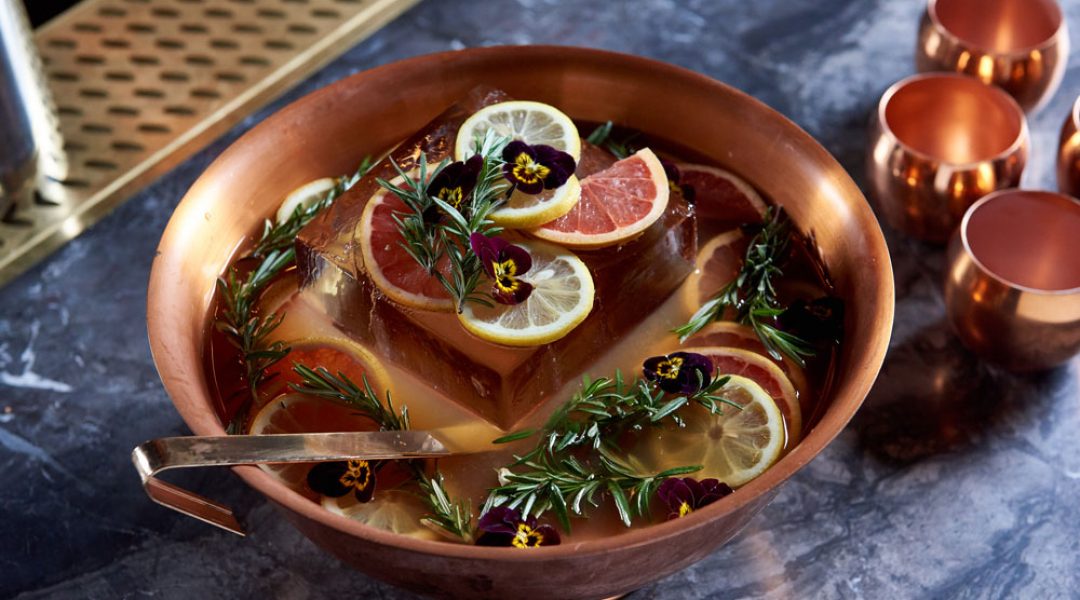 Add all ingredients, except garnish, to punch bowl. Stir for 15 seconds to combine.