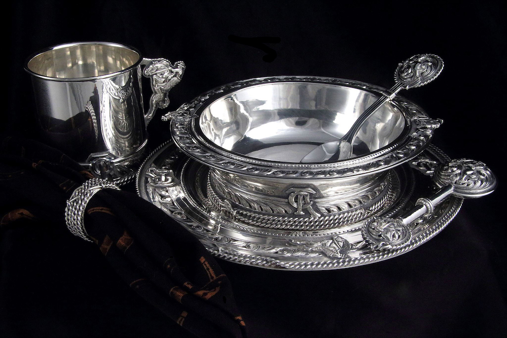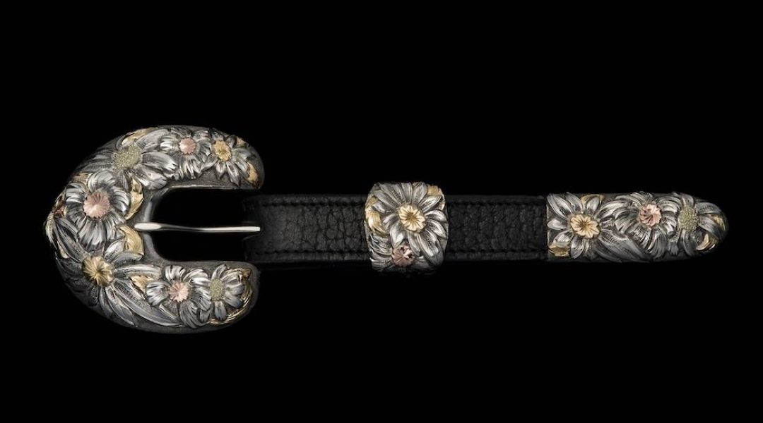 Photography: (featured) Custom buckle set in rose gold, yellow gold, and sterling silver; (slideshow) Hand-sculpted and -engraved sterling silver personal ranch buckle; Hand-sculpted, -engraved, and -filigreed child’s dinner set in heavy-gauge sterling silver decorated with bucking horse and rider figures, Custom buckle sets in rose gold, yellow gold, and sterling silver; (inset) Decanter and funnel set in sterling silver and 14-karat yellow gold. All images courtesy Leslie Hardy