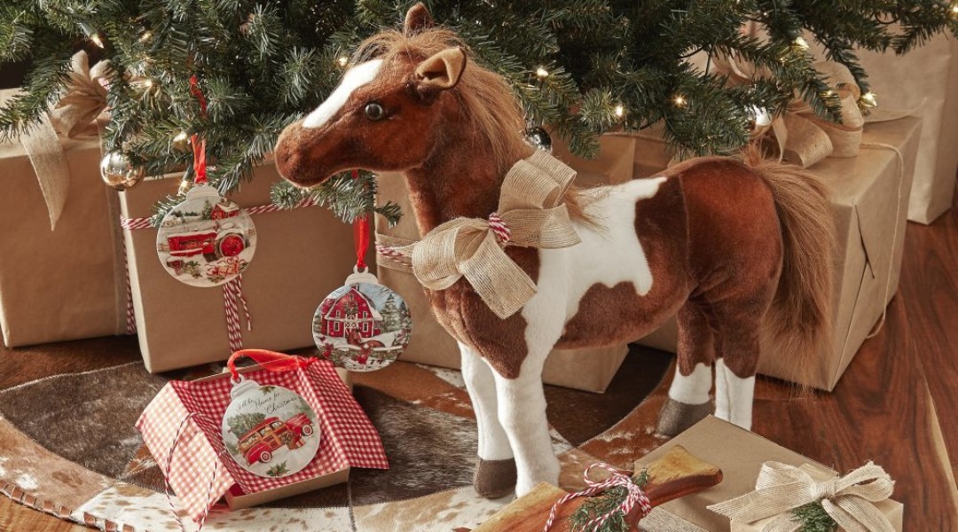 LEFT: Mesquite cutting board with turquoise inlay ($89), hatcreek.us. Cowhide Christmas tree skirt (starting at $129), terraleathertx.com. Nostalgic Christmas ornaments ($7 each), cowboysindians.com/shop. Plush mustang ($38), maverickwesternwear.com.