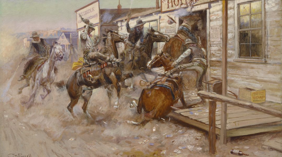 A poker game fueled by whiskey explodes in gunfire outside a frontier saloon. A wounded cowboy falls from his horse, his foot hung up in a stirrup, while his two buddies open fire on the gambler who shot him. The gambler is hit as well, falling back against the rough wall of the saloon, as a smoking six-shooter dangles from his hand. Panicked horses scramble at the shooting, desperate to get away. It’s all captured in oil on canvas in In Without Knocking, another action-packed painting of the Old West, from the brush of the legendary cowboy artist Charlie Russell. Today, you can stand exactly where that painting was created, in Russell’s restored historic log cabin studio in Great Falls, Montana.