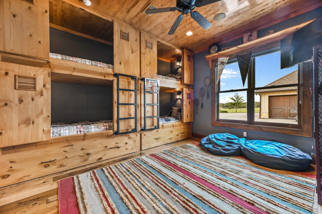 Inside, it’s a home away from home in every room. Gorgeous stonework and hardwood floors envelop the entire home, while a sprawling great room showcases bold Western style: metal ceiling fans, leather furnishings, a corrugated tin ceiling, copper kitchen sinks, and rugged light fixtures to name a few. Then there’s the seven spacious en-suites: some outfitted with built-in bunkbeds, others with sumptuous turquoise upholstery, and all with copious amounts of Western décor ranging from sheepskin to serape.