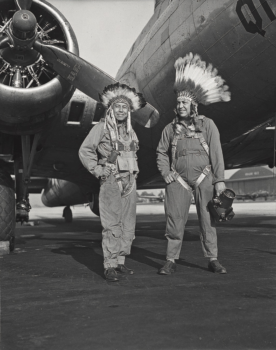 From left: Side gunner Gus Palmer (Kiowa) and aerial photographer Horace Poolaw (Kiowa) in front of a B-17 Flying Fortress at MacDill Field, Tampa, Florida, ca. 1944