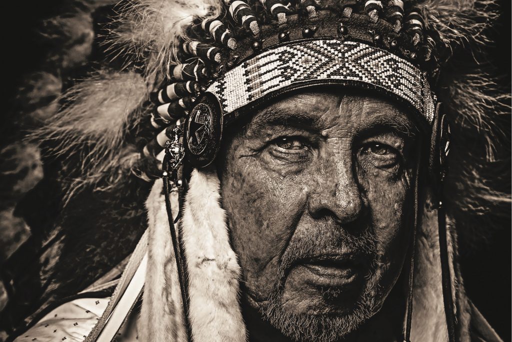 Artist Harvey Pratt in ceremonial headdress