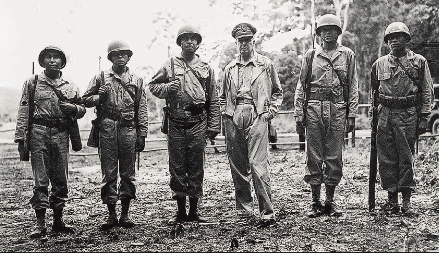 During an inspection trip of American battle fronts in late 1943, Gen. Douglas MacArthur, commander in chief of the Allied forces in the South Pacific, stands with (from left) Staff Sgt. Virgil Brown (Pima), 1st Sgt. Virgil F. Howell (Pawnee), Staff Sgt. Alvin J. Vilcan (Chitimacha), Sgt. Byron L. Tsingine (Diné), Sgt. Larry Dekin (Diné).