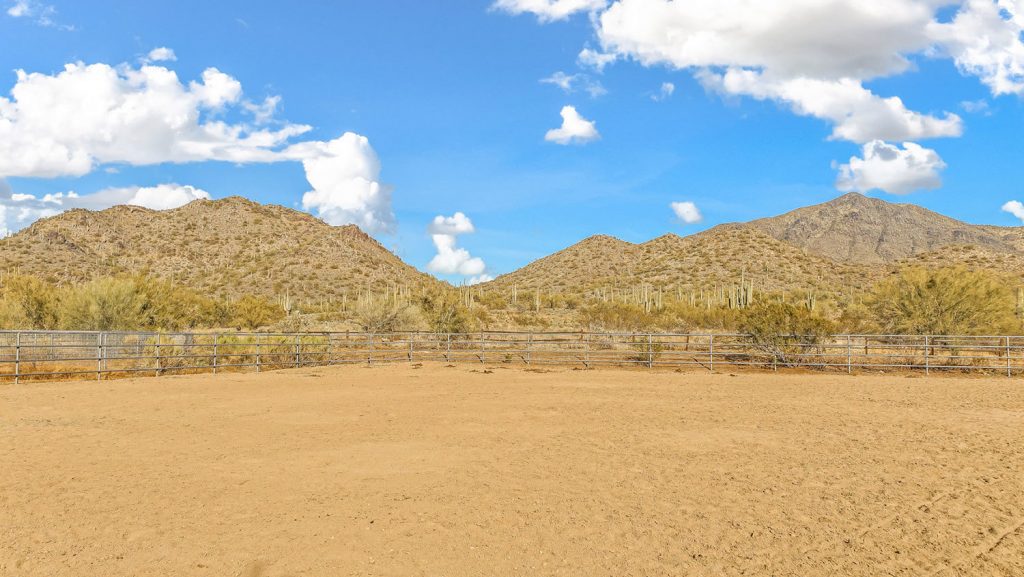 Sitting at an elevation of 2,126 feet, the equestrian property encompasses about 6 acres of Sonoran Desert beauty in the town of Cave Creek, not far from Scottsdale. The equine facilities, set against the backdrop of mountain views, include a seven-stall barn, tack room and feed storage, turnouts, exercise walker, round pen, and riding arena – all underneath a blanket of clear blue skies.