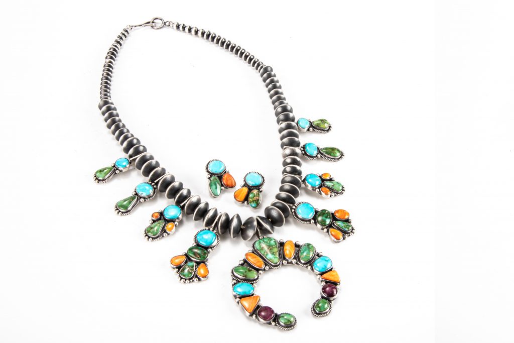 Navajo multi-color squash blossom necklace and earrings, Made in New Mexico ($5,999), spiritofsantafe.com