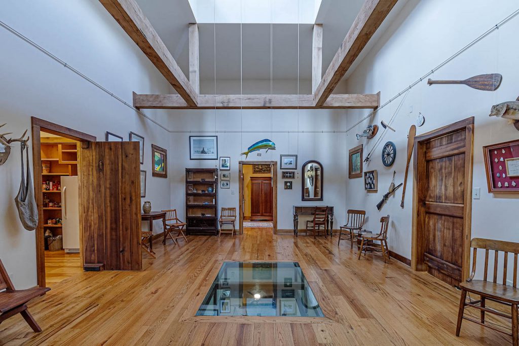 The home features three bedrooms and three-and-a-half baths, with space and plumbing in place to build a fourth, as well as a spacious, open-concept kitchen with a commercial-grade sink and oven. One of the most interesting features of the home is a clear, in-laid flooring panel providing natural sunlight to the first floor and a clear view of the cupola above.