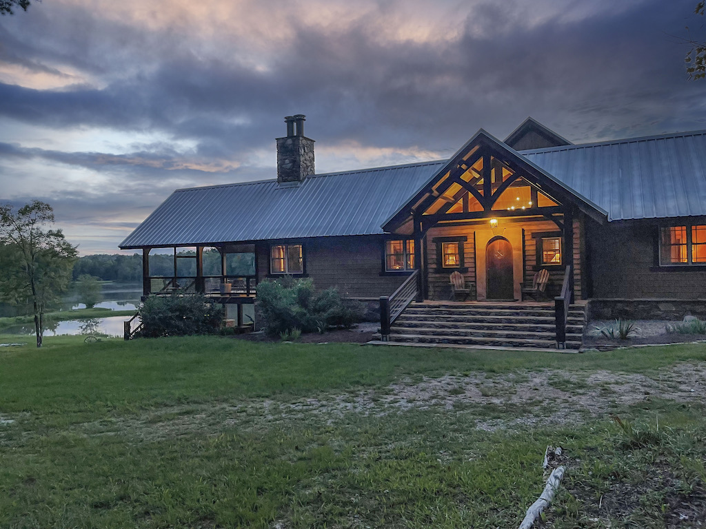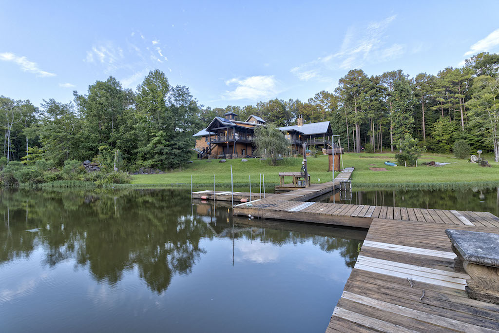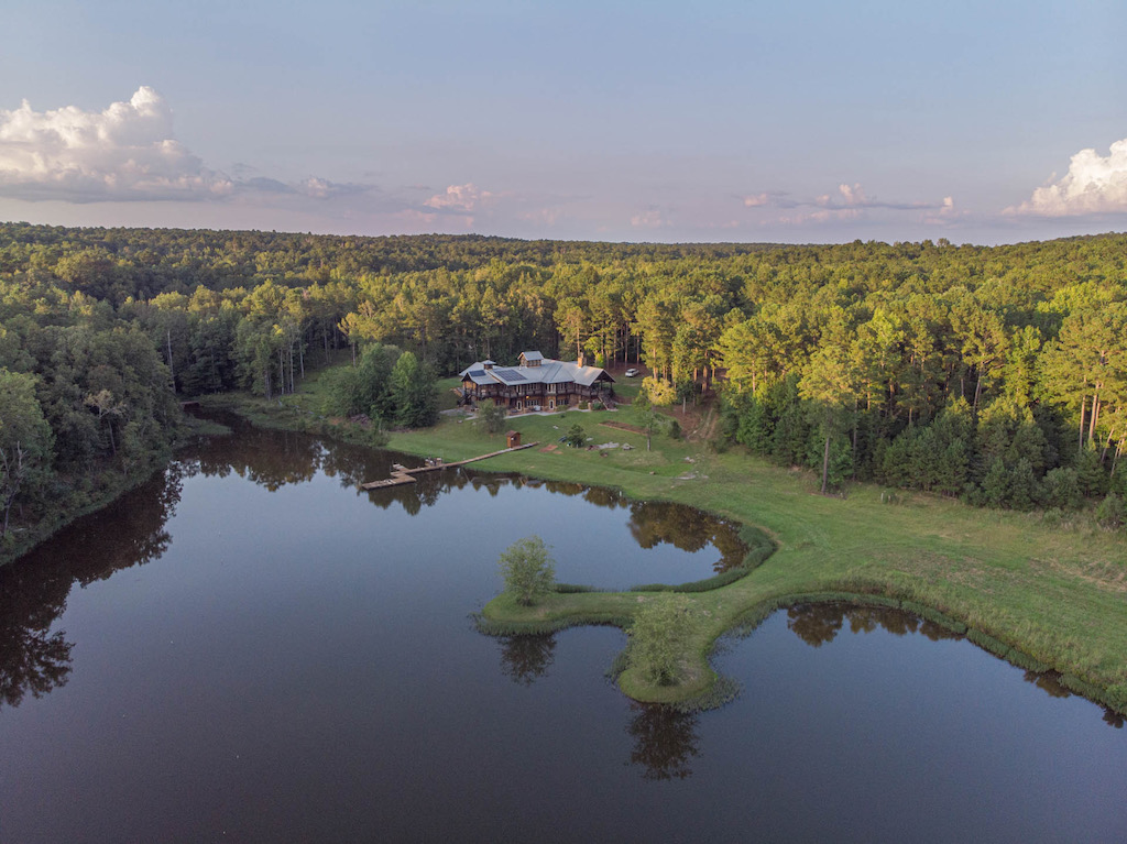 The 6,170-square-foot house sits on the northeast side of a 14.5-acre lake and was designed, sourced, and constructed to reduce environmental impacts. A significant amount of wood and stone was pulled from what is now the lake bottom, kiln-dried, and used throughout the house, including the red and white oak floors, cupola ceiling beams, poplar interior doors, and a grand stone fireplace.