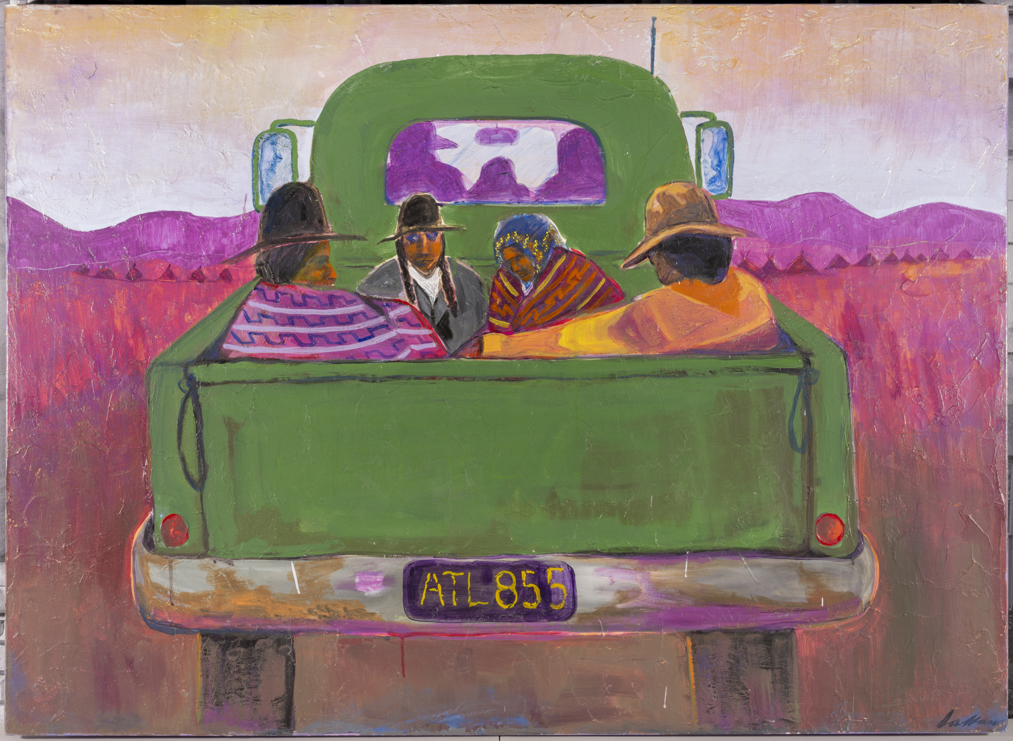 Jean LaMarr, Going Back to the Rez, 1974, oil on canvas, 36” x 49.5 ”. Collection of the Nevada Museum of Art, purchased with funds from deaccessioning© Jean LaMarr