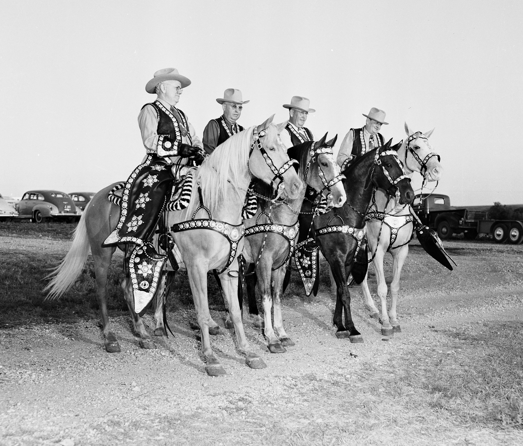 Sid Richardson, a director, (far right) on horseback with (left to right) Mayor Edgar Deen (Southwestern Exposition and Fat Stock Show manager), Ernest Allen (show vice president), W. R. Watt (show president); Fort Worth Star-Telegram; September 13, 1947; University of Texas at Arlington Libraries, Special Collections