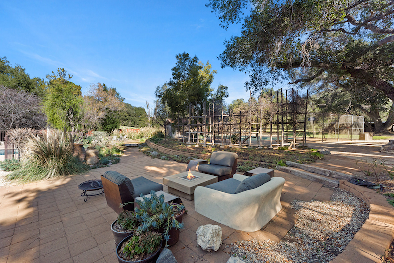 Only 35 minutes from Beverly Hills, the gated equestrian estate has numerous structures and amenities such as stables for horses, a tack room/barn, a tennis court, large swimming pool with spa, gardens, koi pond, and even a chicken coop.