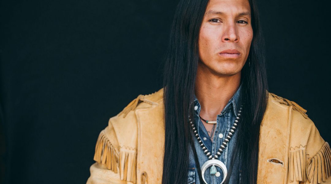 Wrangler denim pearl snap shirt (C&I’s own); Roy Tracy (Diné) 24” Navajo pearls with Navajo Naja pendant and Kingman turquoise (custom made), Navajo Naja pendant on latigo leather strap (custom made), Instagram: @roytracynavajojewelry; Vintage fringe leather jacket (contact for pricing), shop.chadisham.com; Braided horse hair and silver bracelet (model’s own); Native American chief ring (model’s own); Cinch jeans (C&I’s own).