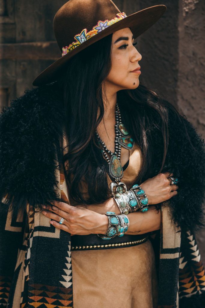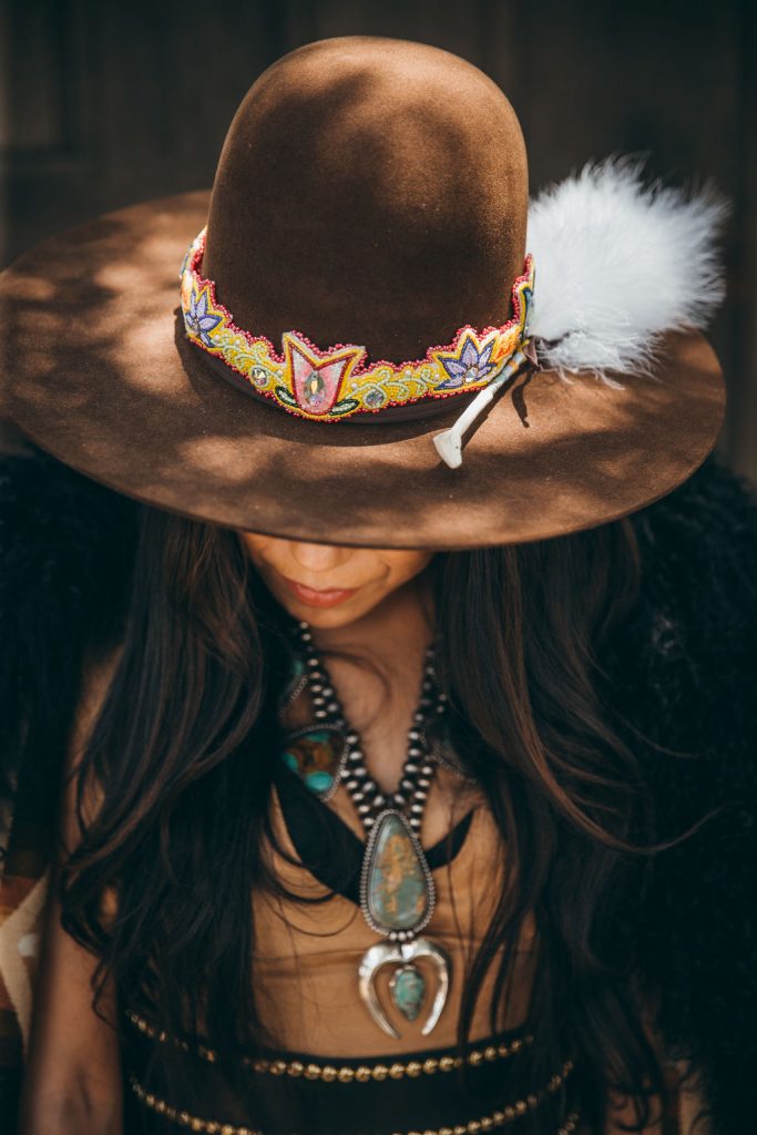 Smithbilt hat ($375), smithbilthats.com; Beaded hatband by Florence Saddleback (model’s own); Faux Eagle Plum (model's own); Harding Oxford duster robe ($2,800), lindseythornburg.com; The Finley Turquoise statement necklace ($4,999); callicosilver.com; Roy Tracy (Diné) Navajo pearl and Naja pendant with Cerillos turquoise necklace, Kingman turquoise bracelets, Candelaria turquoise old style cuff, Old style Navajo bracelet with Sleeping Beauty turquoise, Morenci turquoise and solid tufa cast cuff, Crescent Valley turquoise cuff (custom pieces), Instagram: @roytracynavajojewelry; Custom suede two-piece dress ($310.76), Custom Gilbert Crowchild Studded belt ($233.07), Instagram: @steph_crowchild.