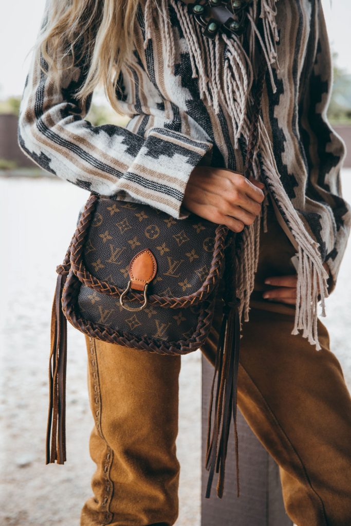 Lakota felt hat ($165), charlie1horsehats.com; Bazaar Taglia blanket jacket ($710), leddys.com; Vintage turquoise squash blossom necklace ($1,200), westerntradingpost.com; Leather and Vodka Saint Cloud Louis Vuitton purse ($2,650), kemosabe.com; Leather pants (contact for pricing), shop.chadisham.com; Idyllwind Strut Whiskey croc print boots ($199.50), bootbarn.com.