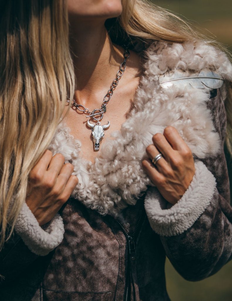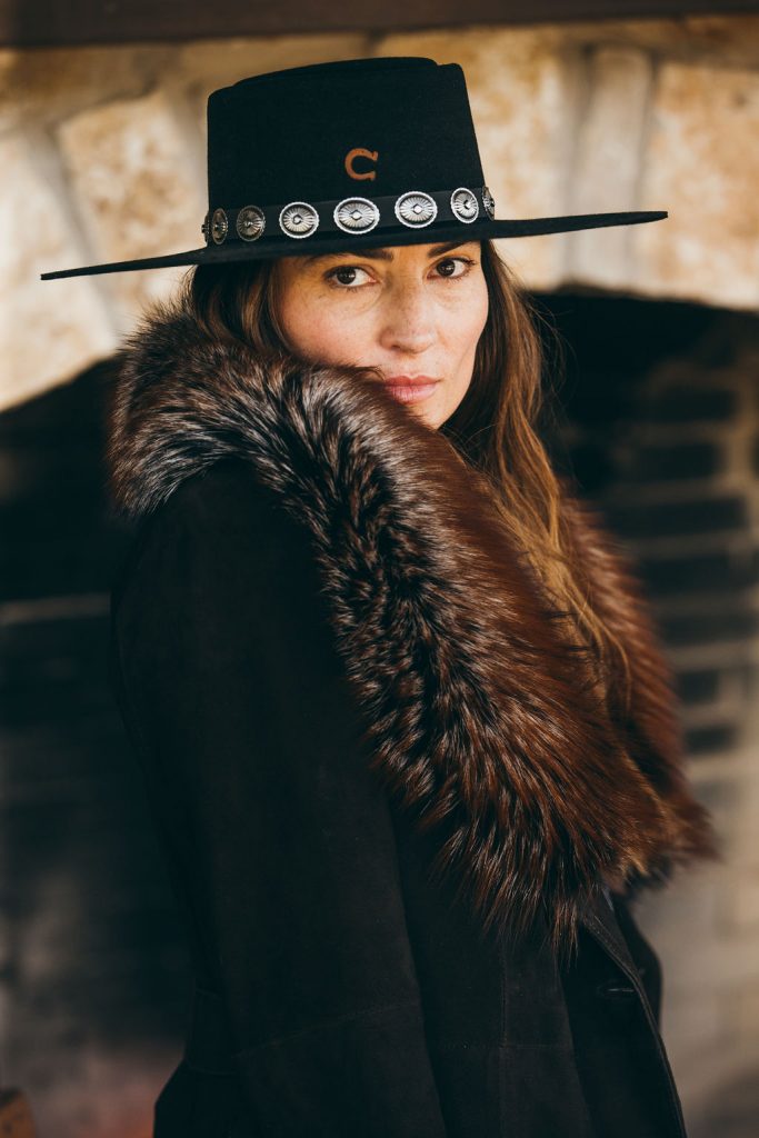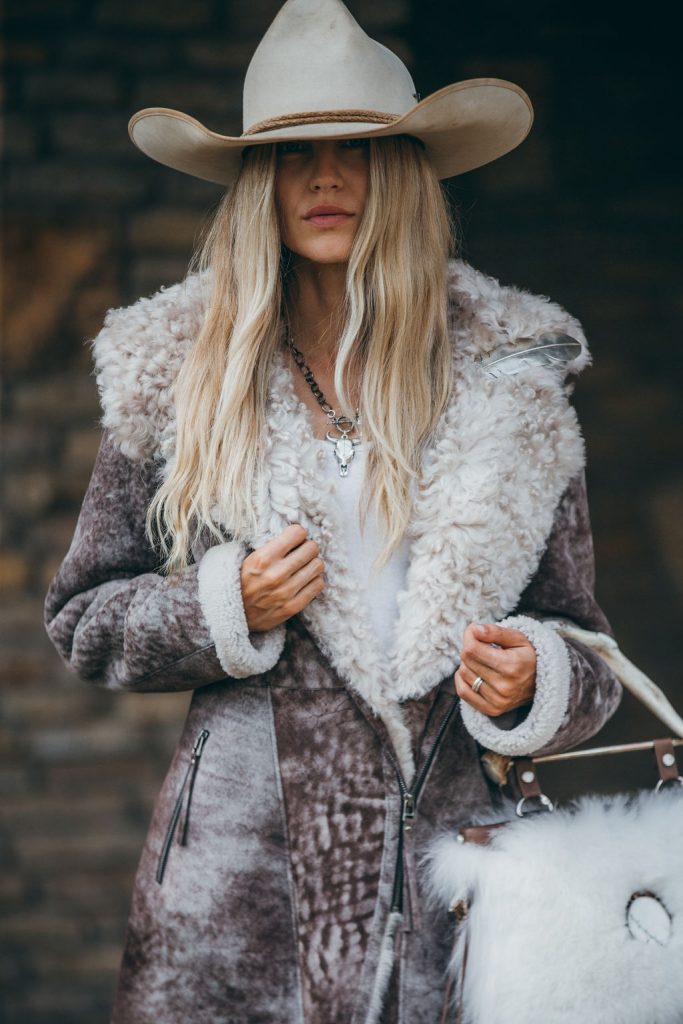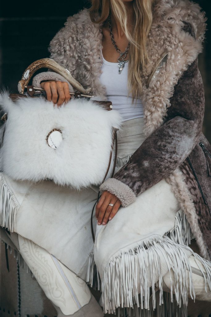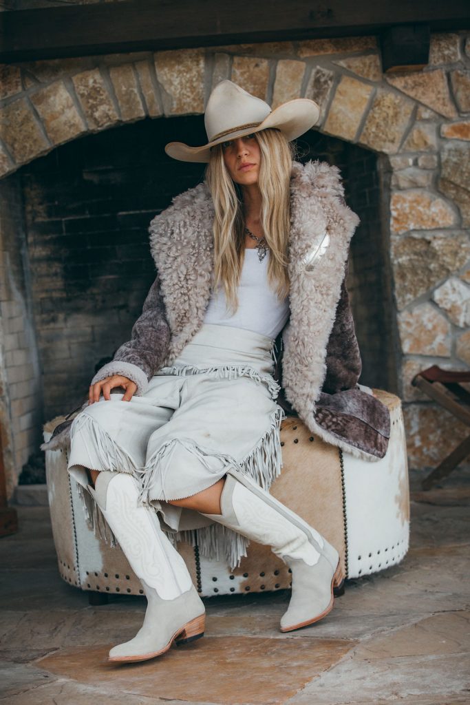 Cowboy hat (model’s own); Sterling silver cow skull chain necklace ($590), rockigorman.com; Galina sheepskin hooded coat ($1,095), overland.com; Feather pin (model’s own); White tank top (C&I’s own); White vintage chaps (contact for pricing), shop.chadisham.com; White Arctic Fox purse ($6,050), kemosabe.com; Lindsay boots ($1,295), kemosabe.com.