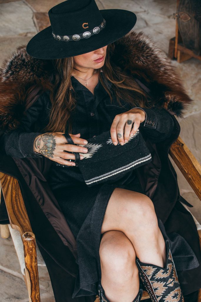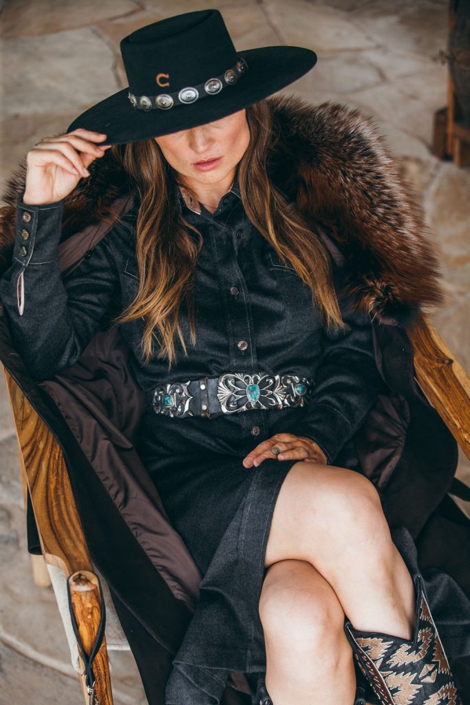 High Desert felt hat ($140), charlie1horsehats.com; Alicia suede coat with fox fur trim ($995), overland.com; Cashmere button-up dress ($4,995), maloufontheplaza.com; Vintage Sandcast and turquoise concho belt ($1,500), westerntradingpost.com; Southwestern black wristlet clutch ($39), objectsofbeauty.com; Lidia Vesuvio black boots ($670), oldgringoboots.com.