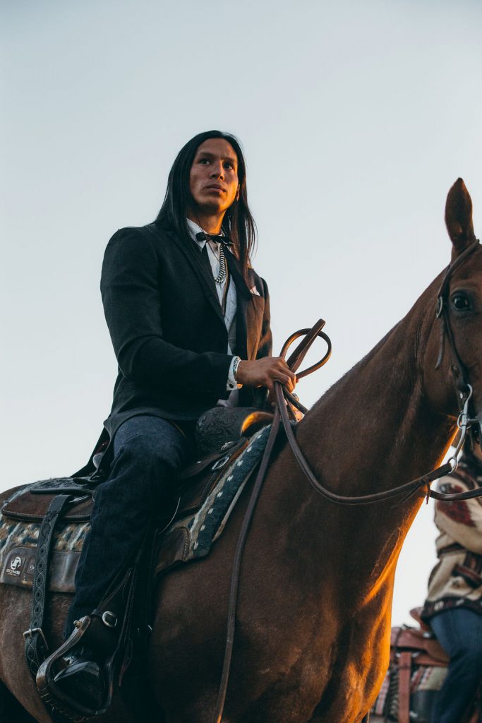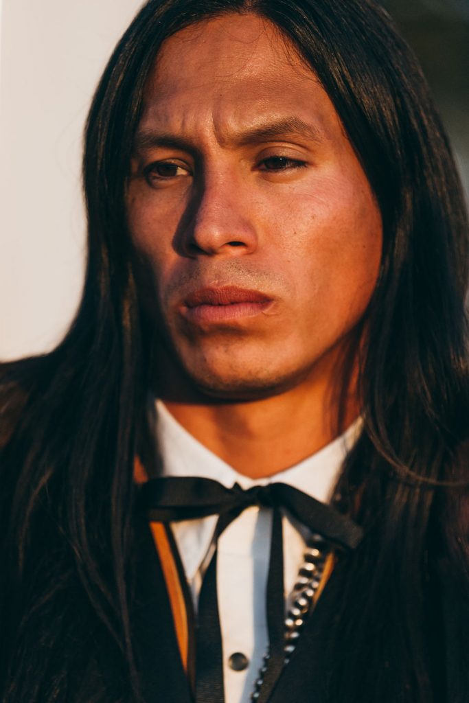 Roy Tracy (Diné) Navajo pearl beaded necklaces, 2 Navajo Naja pendants on latigo leather straps (custom made), Instagram: @roytracynavajojewelry; Custom tux jacket (contact for pricing), leddys.com; White button-up shirt (C&I’s own); Kimes jeans (C&I’s own).