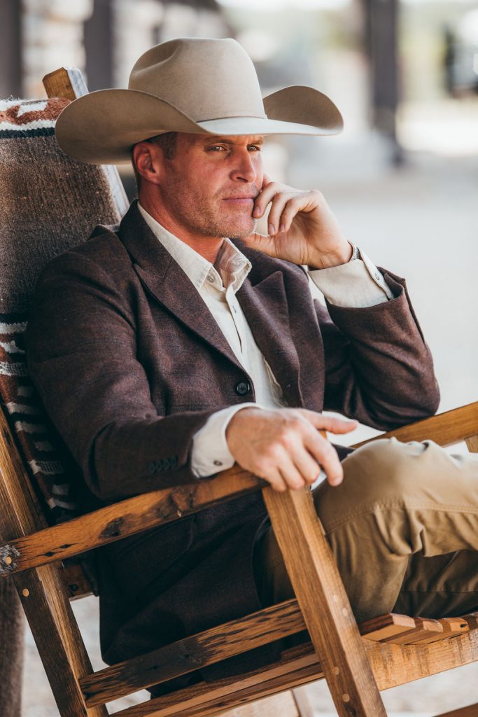 Rough n’ Ready Natural hat ($1,325), resistol.com; Town sportscoat ($350), frontierLS.com; Button-up shirt (C&I’s own); Wrangler khakis (C&I’s own); Randall full quill ostrich boots ($1,595), lucchese.com; Casa Del Sol tequila ($64.99–114.99), casadelsoltequila.com.