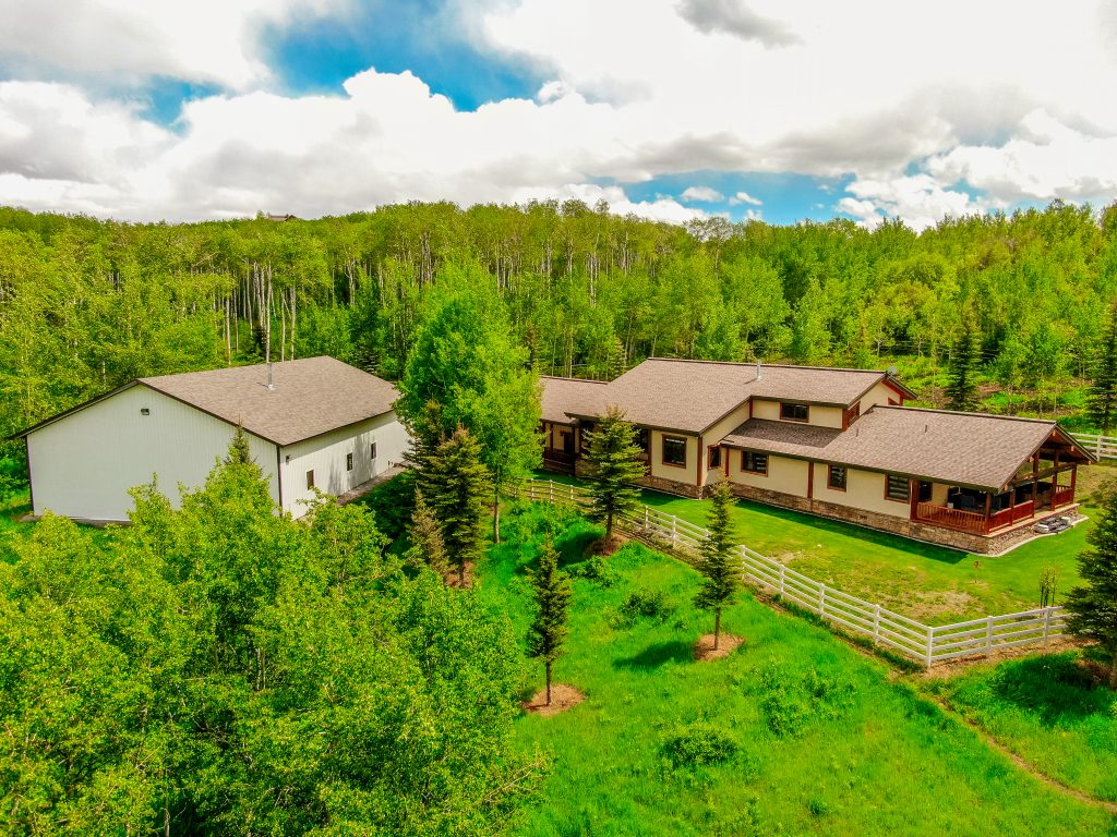 On top of Strawberry Hills is a secluded pathway that takes you through towering Aspen and Evergreen trees to a mountain retreat. Sprawling across 10 fenced acres and totaling 2 parcels, sits a 3 bedroom, 2.5 bath home with a 4200-square-foot shop. As you enter the home, you are greeted with an open concept living room floor plan with a floor-to-ceiling stone fireplace, log accents, custom woodwork, and natural light.