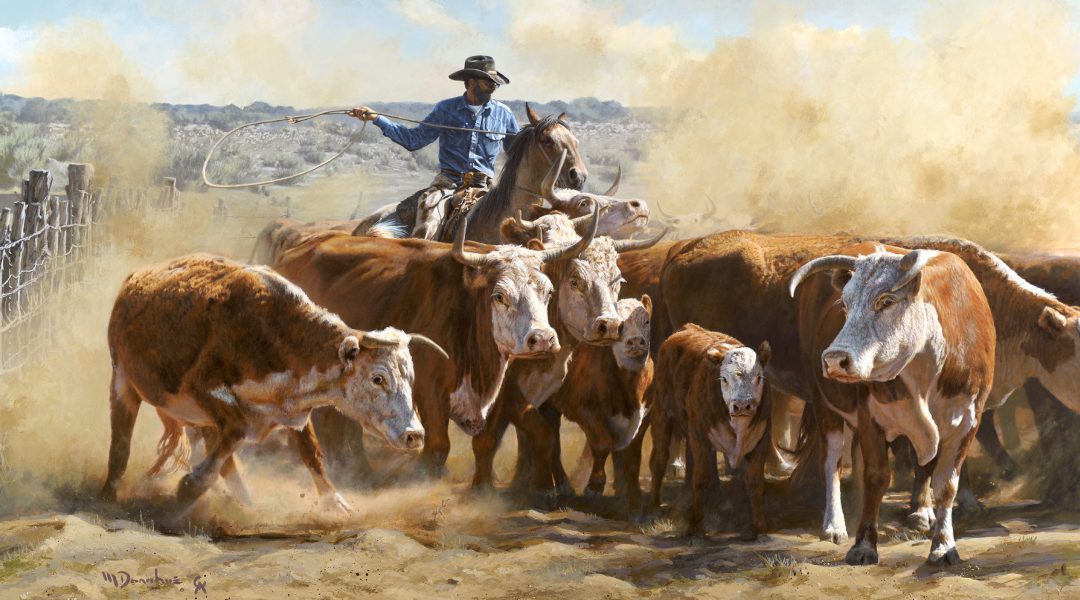 Together, those two influences created the person Donahue is today: one of the top cowboy artists in the nation and a member of the prestigious Cowboy Artists of America. His paintings, realistic and rich with the warmth of dusty corrals and cracked saddle leather, depict the everyday chores of cowboys and ranch hands.