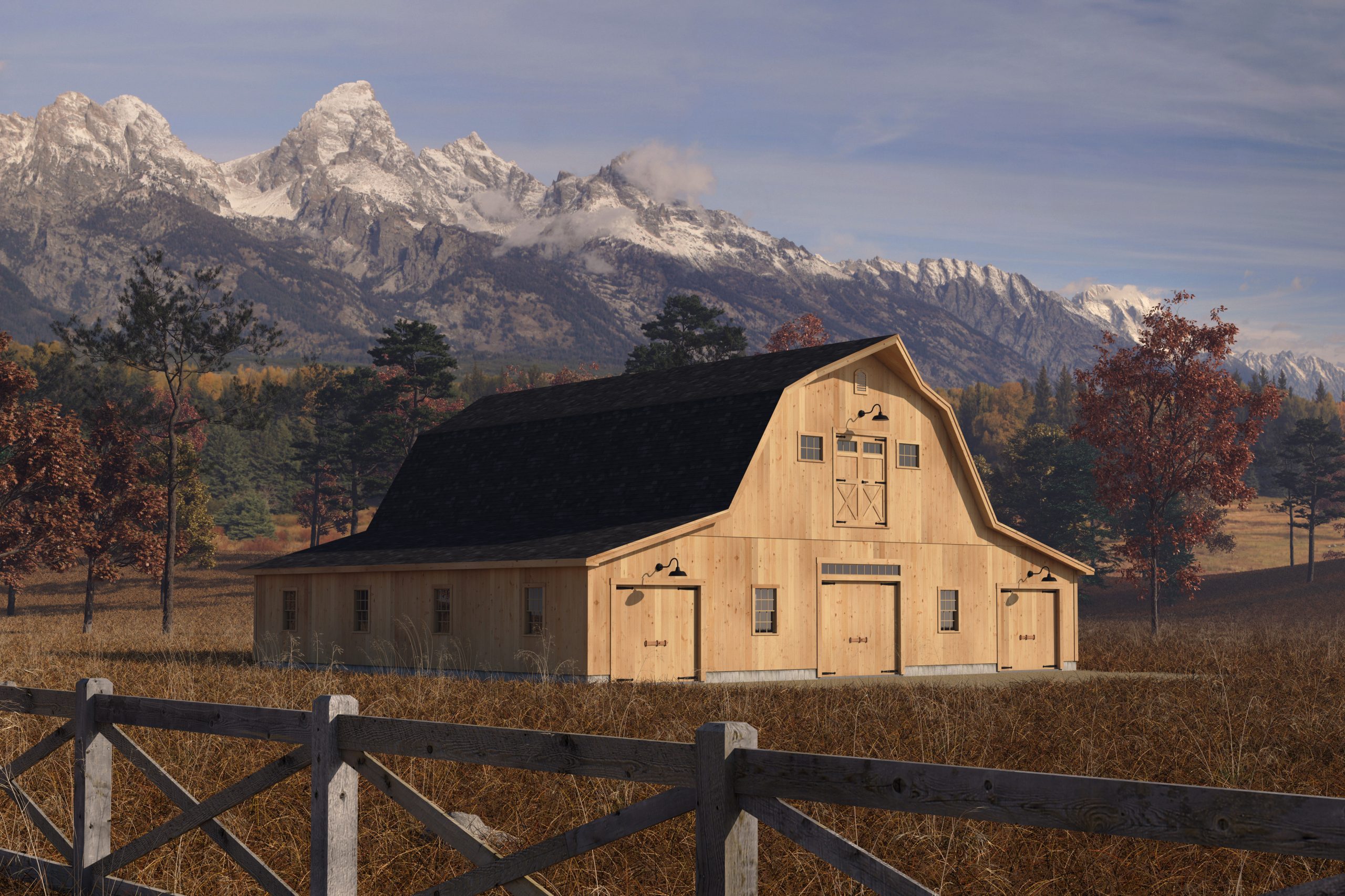 Inspired by the barns of the West, the Barn Yard's Homestead kit features a gambrel design, which maximizes upstairs living space as well as a practical first floor with double lean-tos.