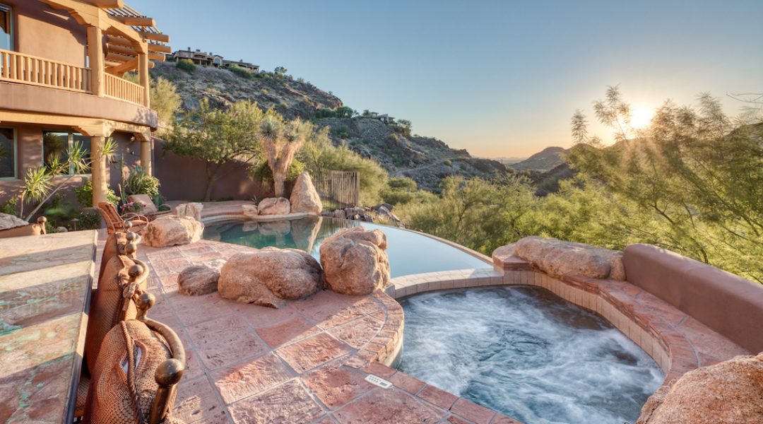 Las Brisas Haven is built into Mummy Mountain and blends seamlessly into its natural surroundings. There are rock outcroppings integrated into the 7,318-square-foot home, a natural extension of the surrounding outdoor beauty.