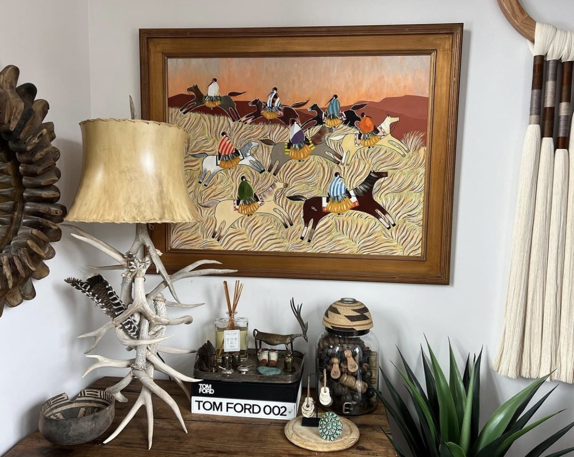 Burk: I am more of an introvert, so I study a lot of books about Western art. Western artists from the past, like the Taos Society of Artists. I sometimes go to museums, but I get more inspired intellectually than physically, so I prefer books. I really started from nothing with all this. I didn’t attend any school or study arts, so these guys were my teachers basically. I studied their paintings at the beginning so I could learn and find my own style down the road. I still didn’t want to give up folk art, so I decided why not mix up the wo!