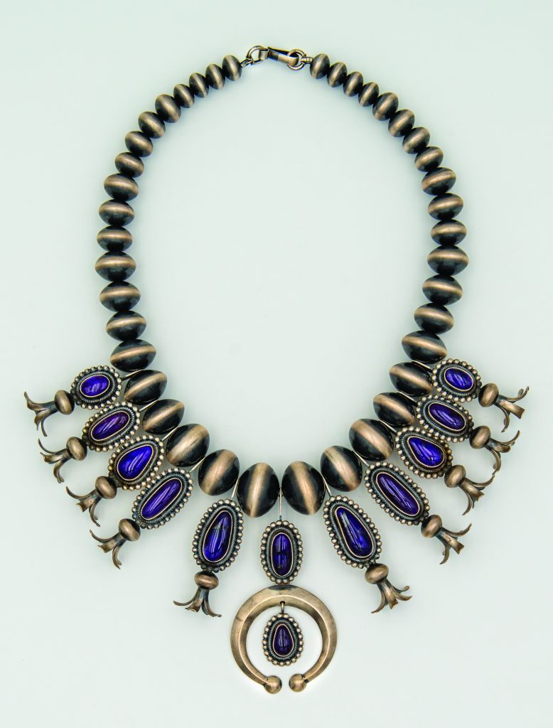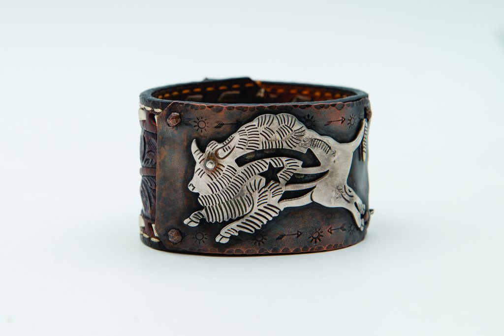 [1] Ernest Roy Begay (Navajo) Rare Sugilite Handmade Sterling Necklace ($25,350), coloradojo.com [2] City Stripes silk wild rag ($54), cowboywildrags.com [3] Wind Walker necklace ($760), bcdfineart.com [4] The Bad Bronc Handmade Sterling rattler and chain necklace with Carico Lake Turquoise ($985), jewelrymannick@yahoo.com [5] Rising Buffalo leather cuff ($389), weatheredsouljewelry.com